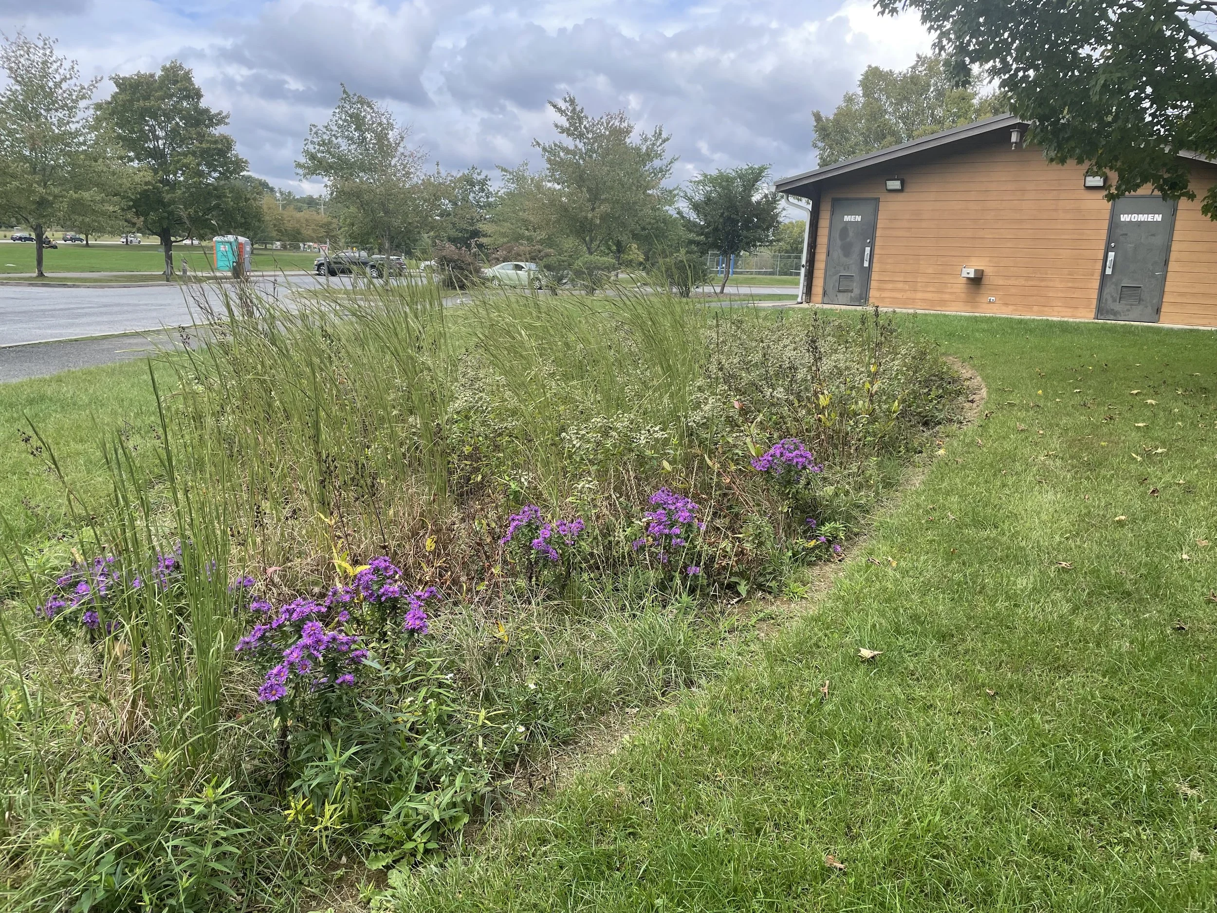Because of the nature in which this rain garden was constructed (water storage below, dryer bioretention soils on top) plants were selected that tend to do well on the dryer side, but can also withstand bouts of inundation. The planting includes: Andropogon virginicus (broomsedge bluestem), Asclepias incarnata (swamp milkweed), Asclepias tuberosa (butterfly weed), Aster novae angliea ‘Purple Dome’ (New England aster), Bouteloua curtipendula (sideoats grama), Carex amphibola (creek sedge), Packera aurea (golden groundsel), Penstemon digitalis (foxglove beardtongue), and Pycnanthemum muticum (mountain mint). New Castle County provided funding for the construction of the garden via a grant and the White Clay Wild and Scenic Program provided funding for the plants.